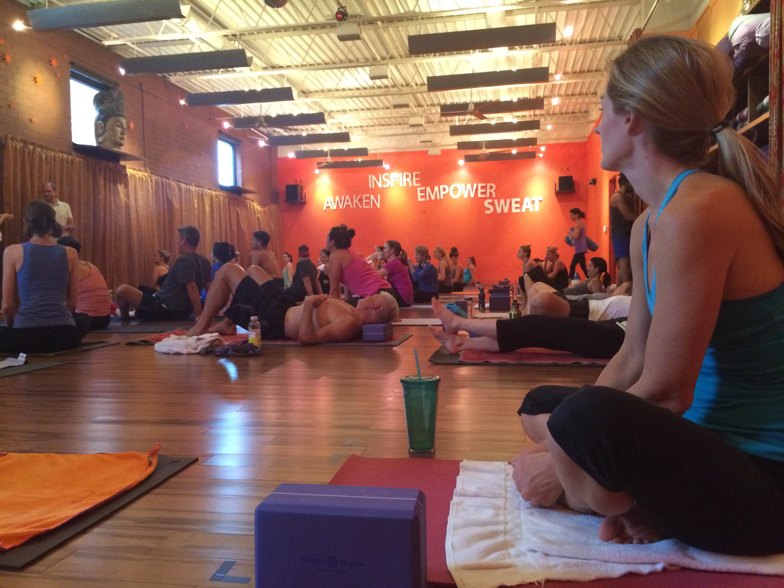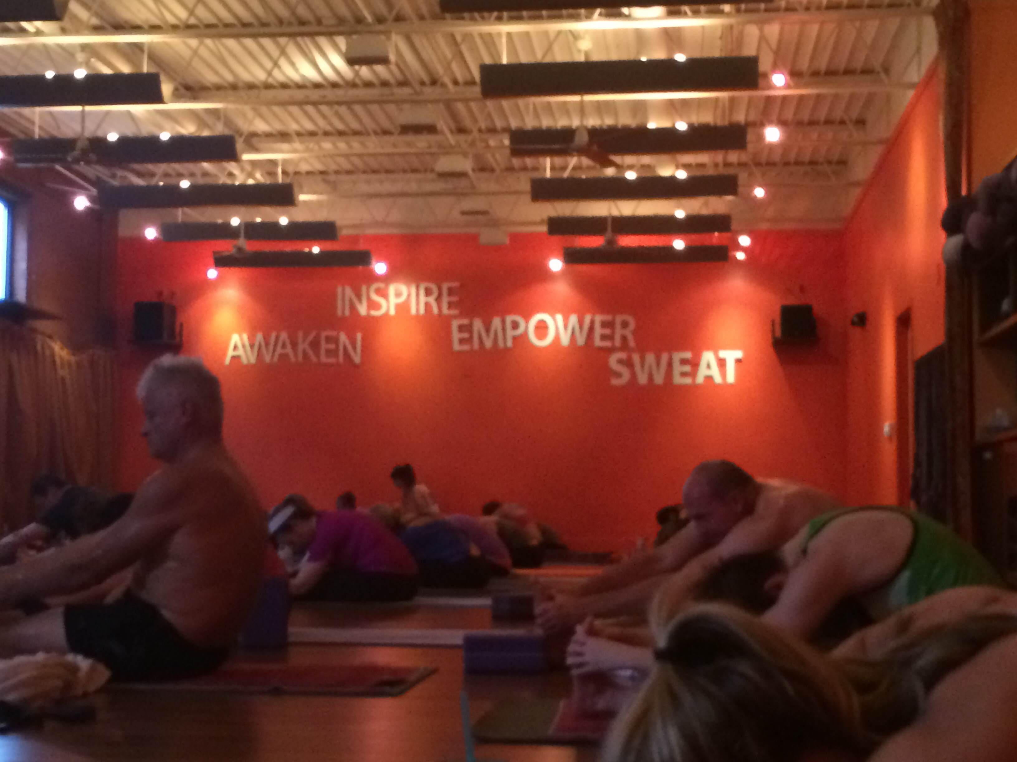 The classes vary in length from 60 minutes to 90 minutes (with 75 in between). The instructors guide practice but do not practice at the front of the room as some studios do. IThroughout practice, you can see the words “Awaken” “Inspire” “Empower” “Sweat” on the wall. Such simple but purposeful words.