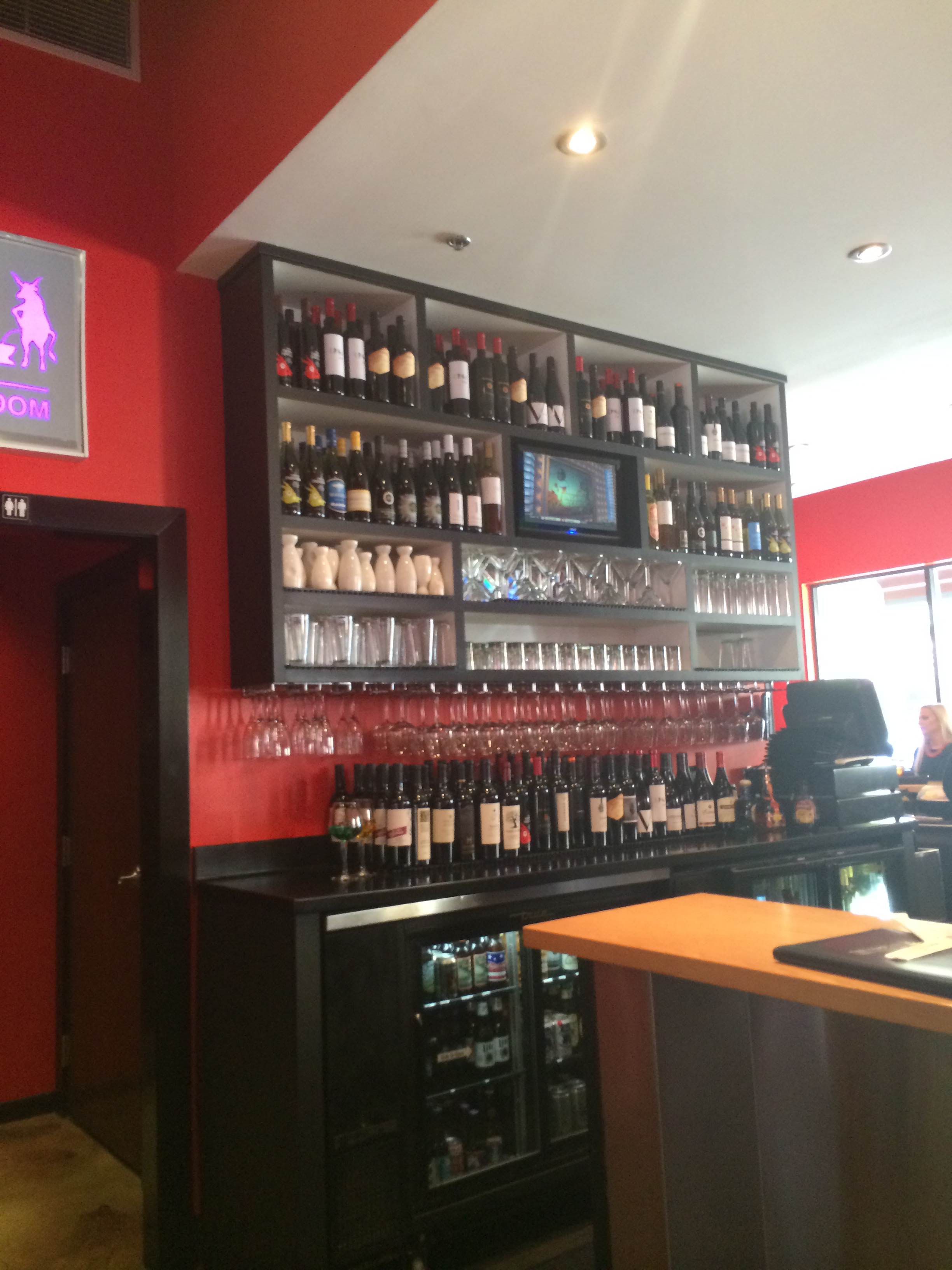The bar also extends around to the sushi bar. So fun to sit there and watch all the specialty rolls being created. Not only does the restaurant have indoor seating and lots of bar space, they have a patio area that’s open in the summer and covered and heated in the winter. Cowfish has done a great job with their decor, keeping everything bright and popping.