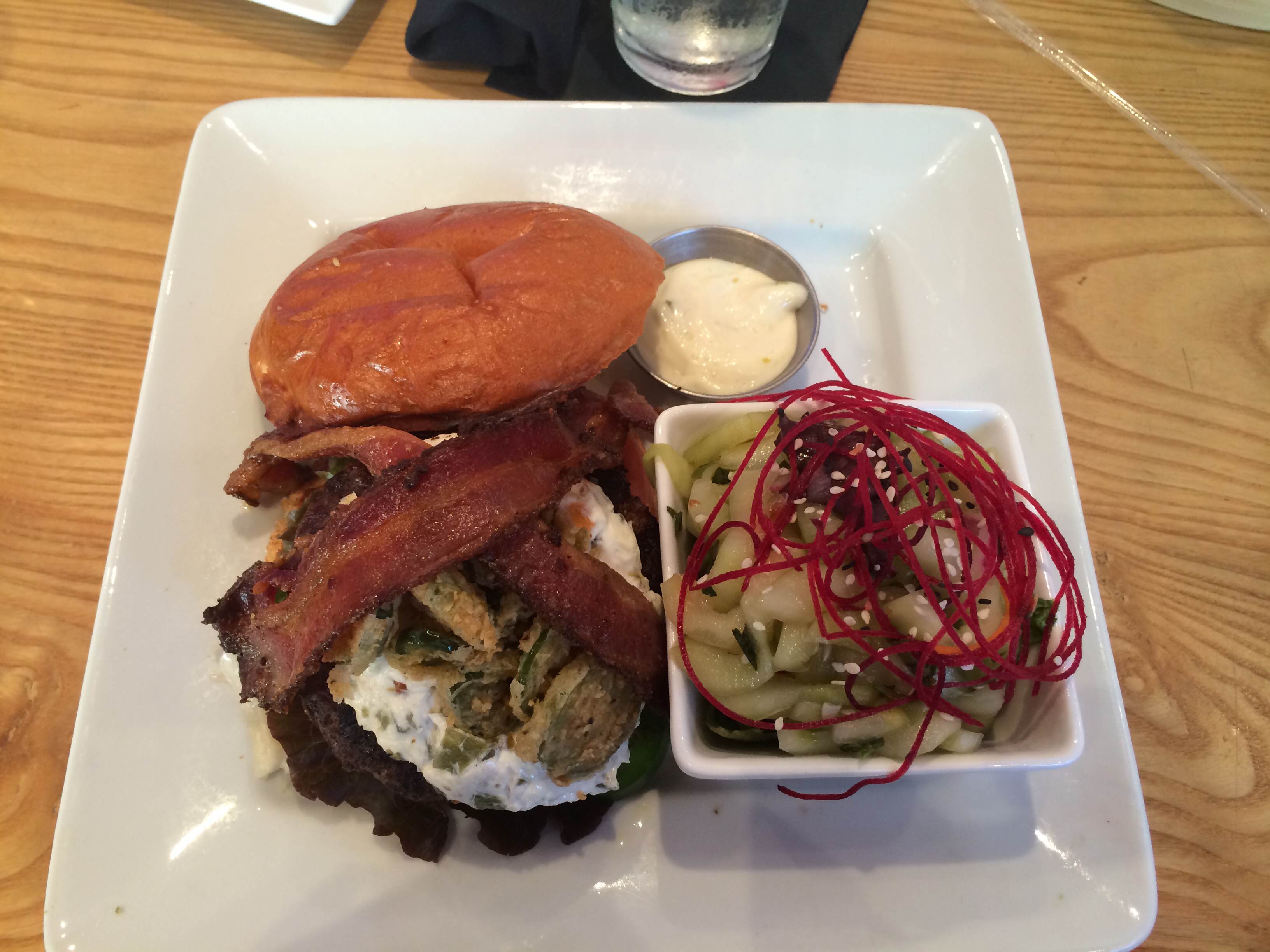 I tend to get burgers when we go, and usually the biggest one I can find. Our waitress last time recommended ordering the trio of sliders which can be made into any of the specialty burgers (great tip for next time). I LOVE the jalapeño popper show stopper which is full of spice and a 1/2 pound of beefy goodness. Also? The sweet and spicy cucumber side is a MUST!
