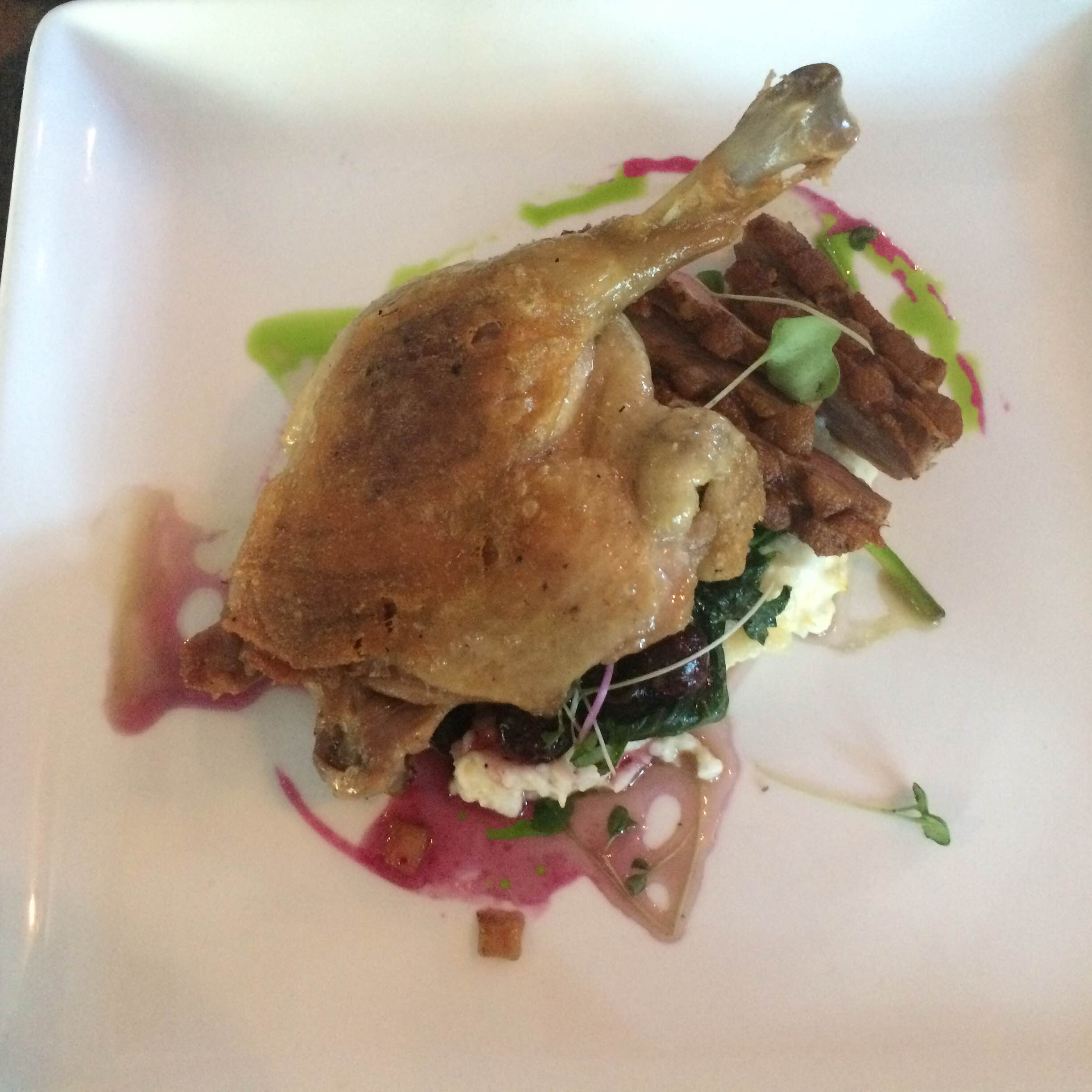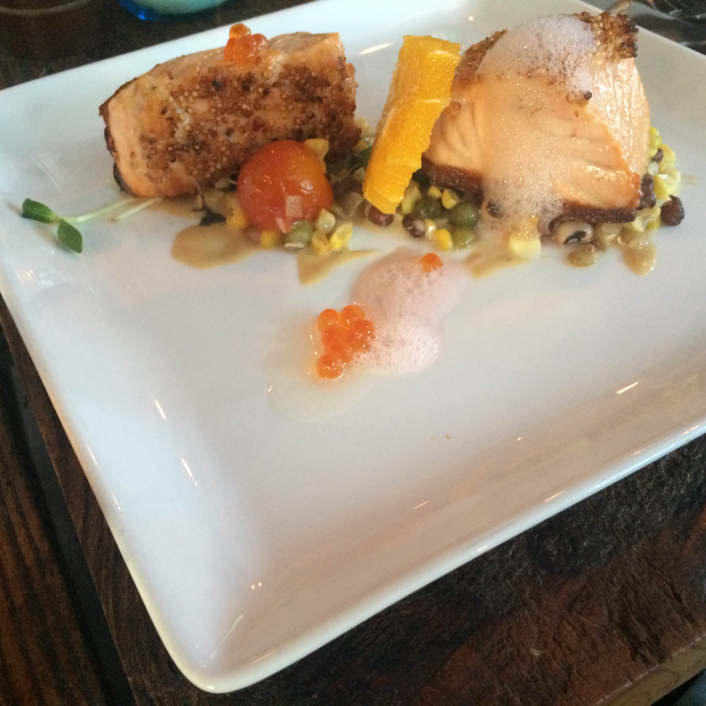 My husband ordered the duck for dinner and it came with delicious blueberry grits and spinach. I had the salmon, which was thick but cooked perfectly.